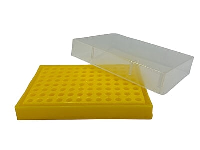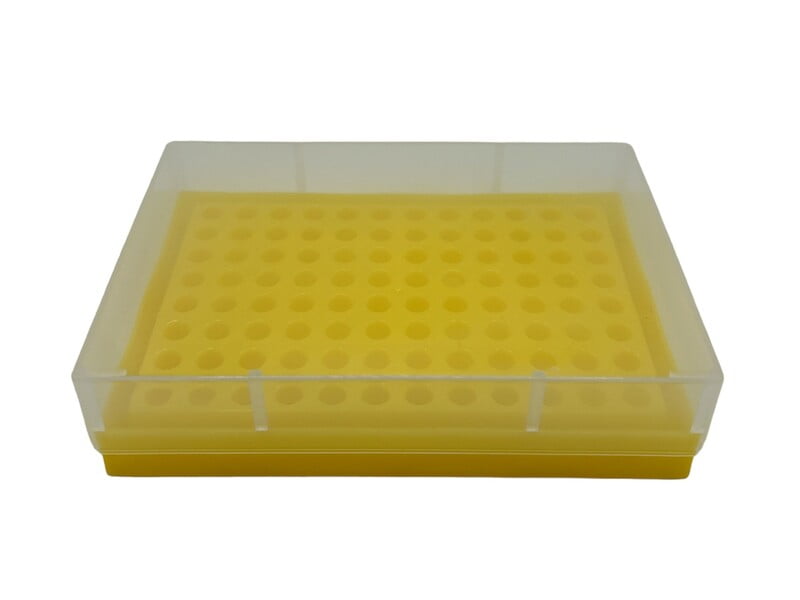 This PCR rack is designed for versatility, accommodating single PCR tubes, strip tubes, and non-skirted PCR plates, all in volumes of either 0.1 ml or 0.2 ml.