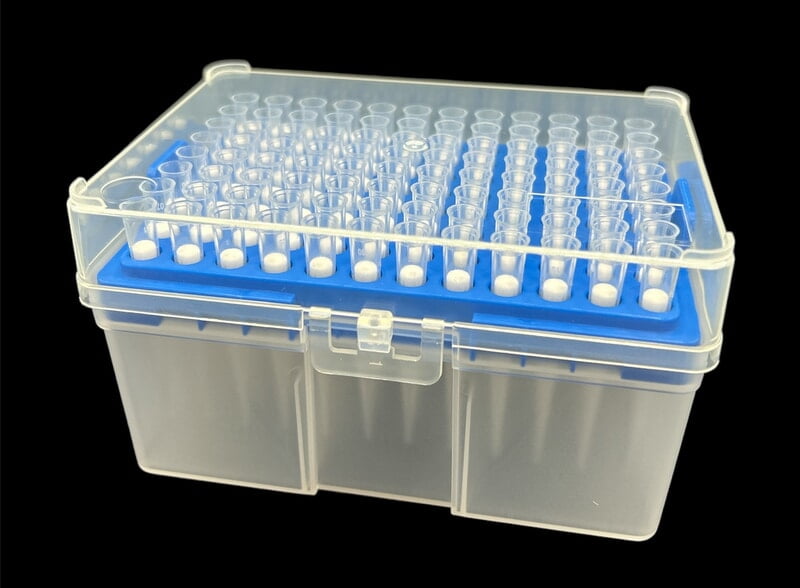 HSI Universal Filtered, low retention, racked, sterile pipette tips, 200 µL, $6.0 per rack (96 tips). 50 racks per box. Room temperature shipping